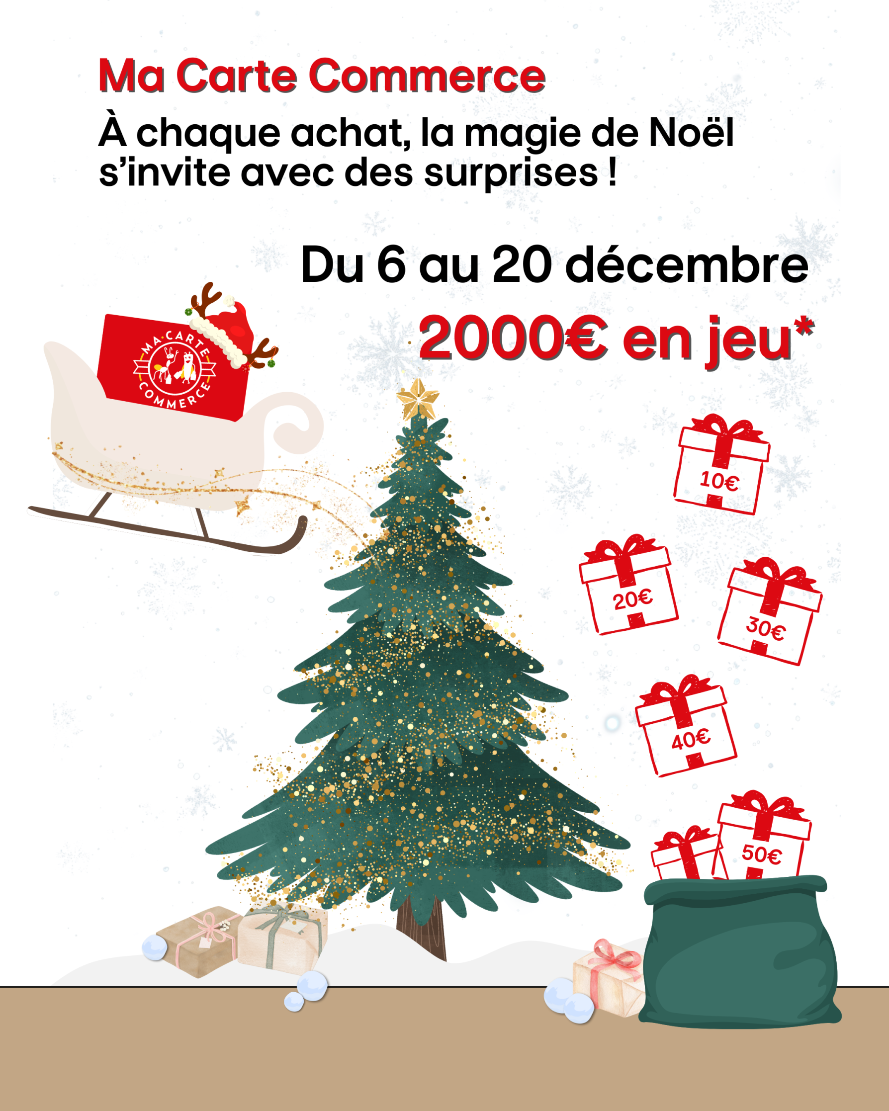 * Lors de vos achats dans les commerces adhérents, vous pourrez bénéficier d’Instants Gagnants sous forme de crédits. Bons de 10€, 20€, 30€, 40€ et 50€ à remporter aléatoirement et offerts par l’association Ma Carte Commerce. Offre réservée aux porteurs de carte “Ma Carte Commerce”, pensez à mettre à jour votre compte !